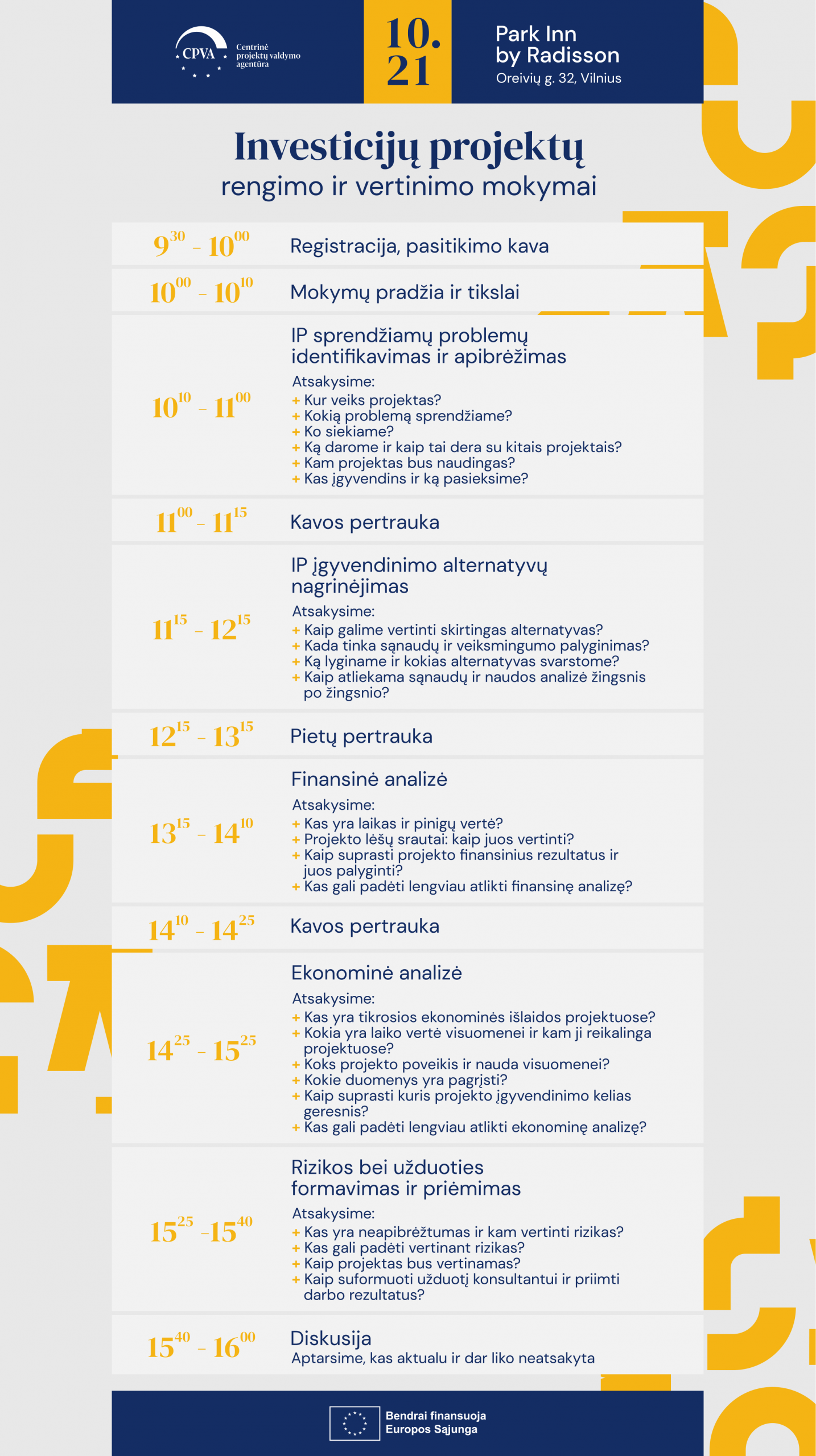 Centrinė projektų valdymo agentūra (CPVA), įgyvendindama projektą „Metodinės ir ekspertinės pagalbos, reikalingos savivaldybėms įgyvendinant teritorines strategijas, teikimas“, spalio 21 dieną kviečia savivaldybių atstovus į investicijų projektų (IP) rengimo ir vertinimo mokymus.