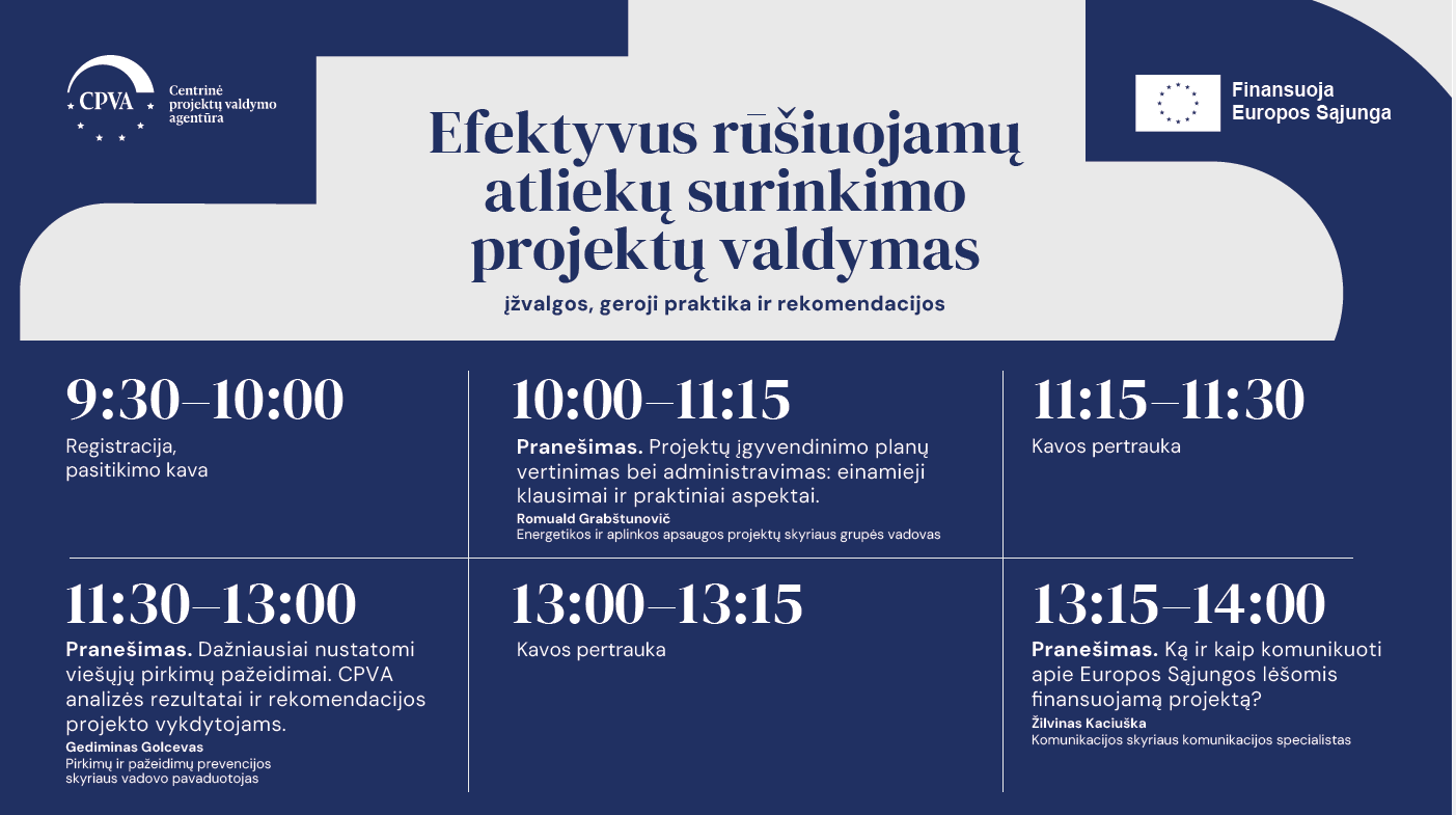 Centrinė projektų valdymo agentūra (CPVA) maloniai kviečia į renginį, skirtą rūšiuojamų atliekų surinkimo projektų įgyvendinimo aktualijoms aptarti. Renginys skirtas atliekų tvarkymo įmonių atstovams, atsakingiems už rūšiuojamų atliekų surinkimo projektų įgyvendinimą.
