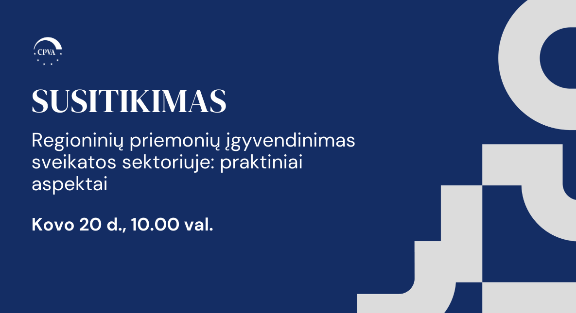 Centrinė projektų valdymo agentūra (CPVA) maloniai kviečia projektų vykdytojus į susitikimą-diskusiją „Regioninių priemonių įgyvendinimas sveikatos sektoriuje: praktiniai aspektai“ apie projektų, įgyvendinamų pagal regioninių priemonių gaires.